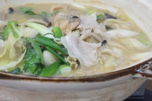 昼食は鍋料理で温かいものを召し上がっていただき、具材のちゃんぽん麺も